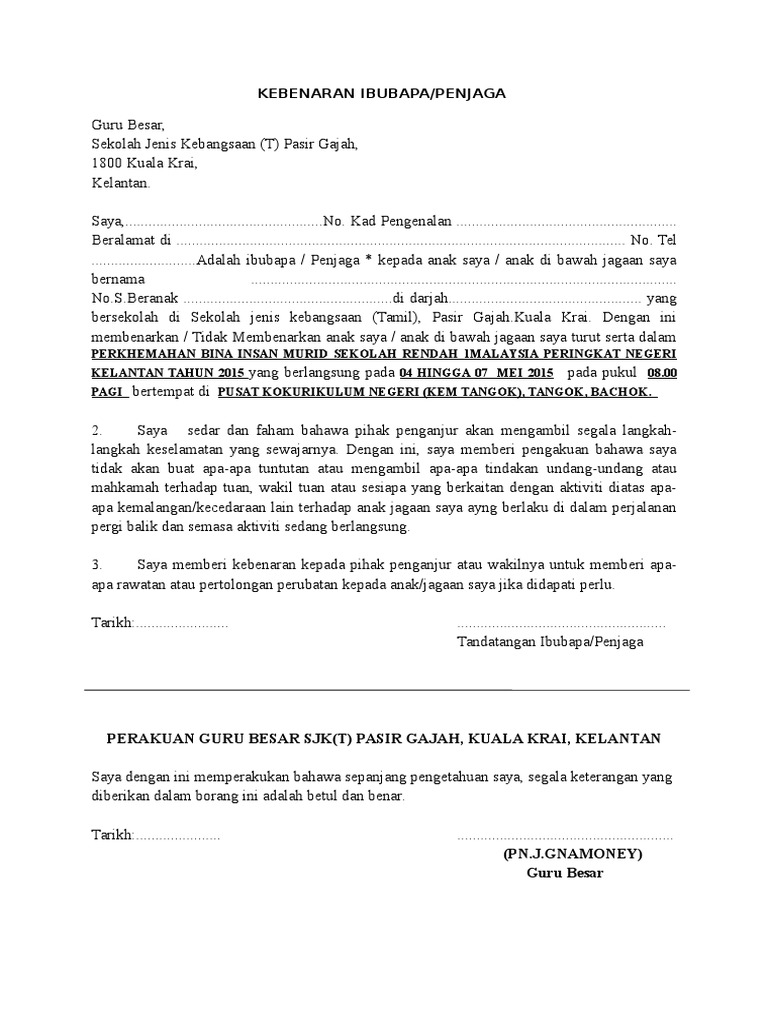 Surat Akuan Kebenaran Ibu Bapa Menyertai Kegiatan Kokurikulum Pdf
